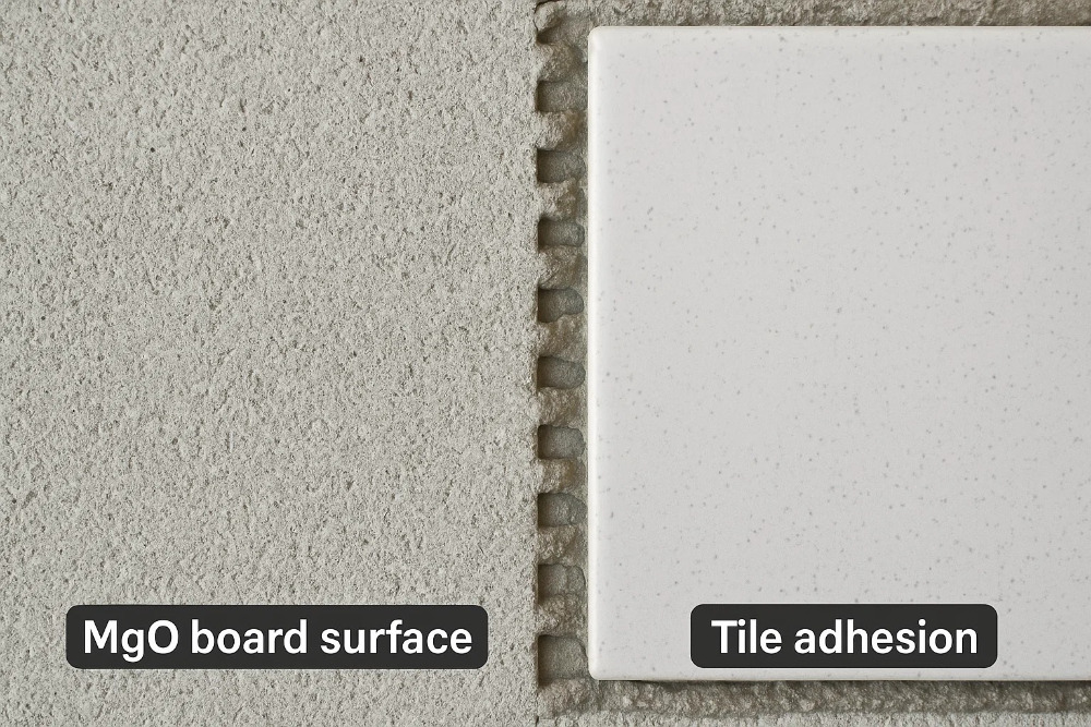 Sa kaibahan, MGO Board ay may isang pambihirang makinis, patag na ibabaw. Ang pagkakapareho na ito ay pinapasimple ang proseso ng pag -tile at binabawasan ang dami ng kinakailangang paghahata. Ang likas na kinis ay nangangahulugang maaari mong madalas na mailapat ang manipis na set nang direkta sa board nang hindi nangangailangan ng karagdagang skim coat. Makakatipid ito ng oras at materyal, na ginagawang mas mahusay ang pag -install.