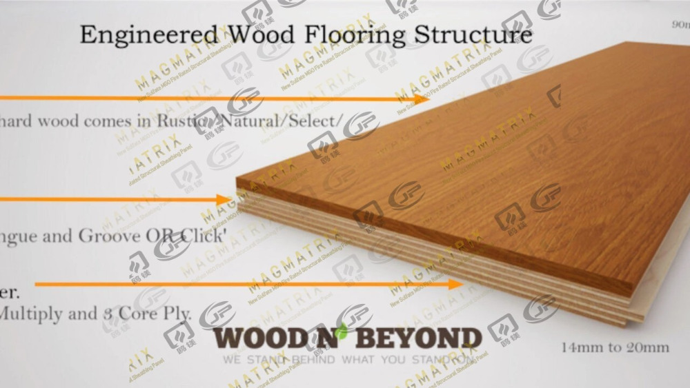 Maramihang mga layer na nakipag-ugnay nang magkasama sa isang pattern ng cross-butil na bumubuo ng engineered na kahoy, na nagpapabuti sa dimensional na katatagan. Ang istraktura ay may isang tunay na kahoy na veneer top layer (2-5mm makapal) na konektado sa ilang mga layer ng playwud. Ang natatanging konstruksyon na ito ay lumilikha ng isang produkto na mas malakas at mas matatag kaysa sa solidong kahoy. Karamihan sa mga produkto ay may mga gilid ng dila-at-groove. Maraming mga tagagawa ngayon ang gumagamit ng mga sistema ng pag-click-lock upang gawing mas madali ang pag-install.