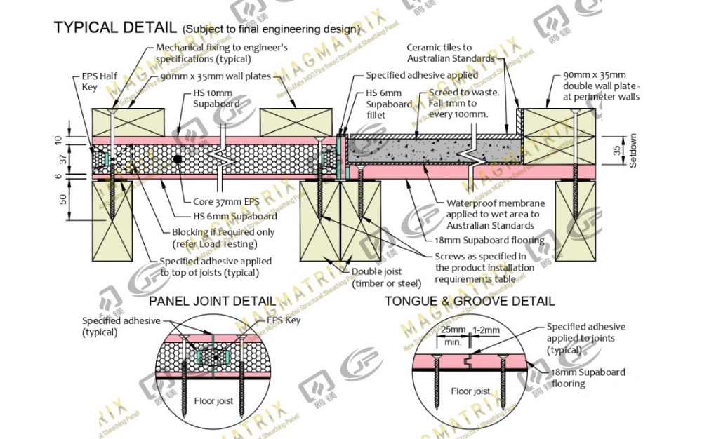 | MGO Subfloor Panels | Magnesium oxide na may mga di-organikong mineral, pinalakas ng fiberglass mesh | 3/4 "kapal, mga gilid ng dila-at-groove, sumasaklaw sa 24" sa gitna | Mahusay - sumisipsip lamang ng 0.34% na kahalumigmigan sa ibabaw | Lumalaban sa sunog hanggang sa 1,472 ° F, mataas na istruktura ng integridad | Madali ang pagsipsip ng kahalumigmigan, nagkakahalaga ng higit pa, maaaring ma -corrode ang mga fastener | Mga banyo, kusina, basement, multifamily pabahay |